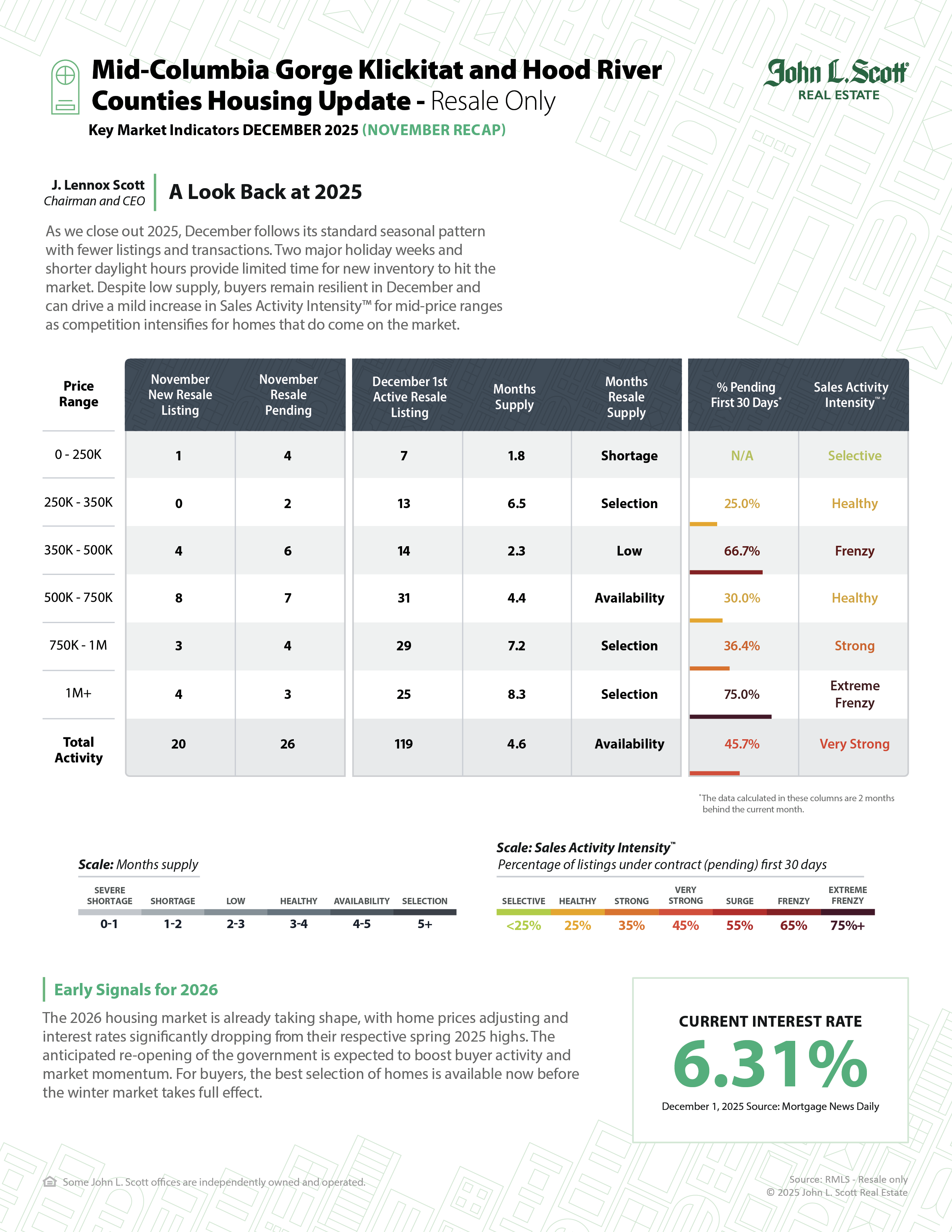 As we close out 2025, December follows its standard seasonal pattern with fewer listings and transactions. Two major holiday weeks and shorter daylight hours provide limited time for new inventory to hit the market. Despite low supply, buyers remain resilient in December and can drive a mild increase in Sales Activity Intensity™ for mid-price ranges as competition intensifies for homes that do come on the market.